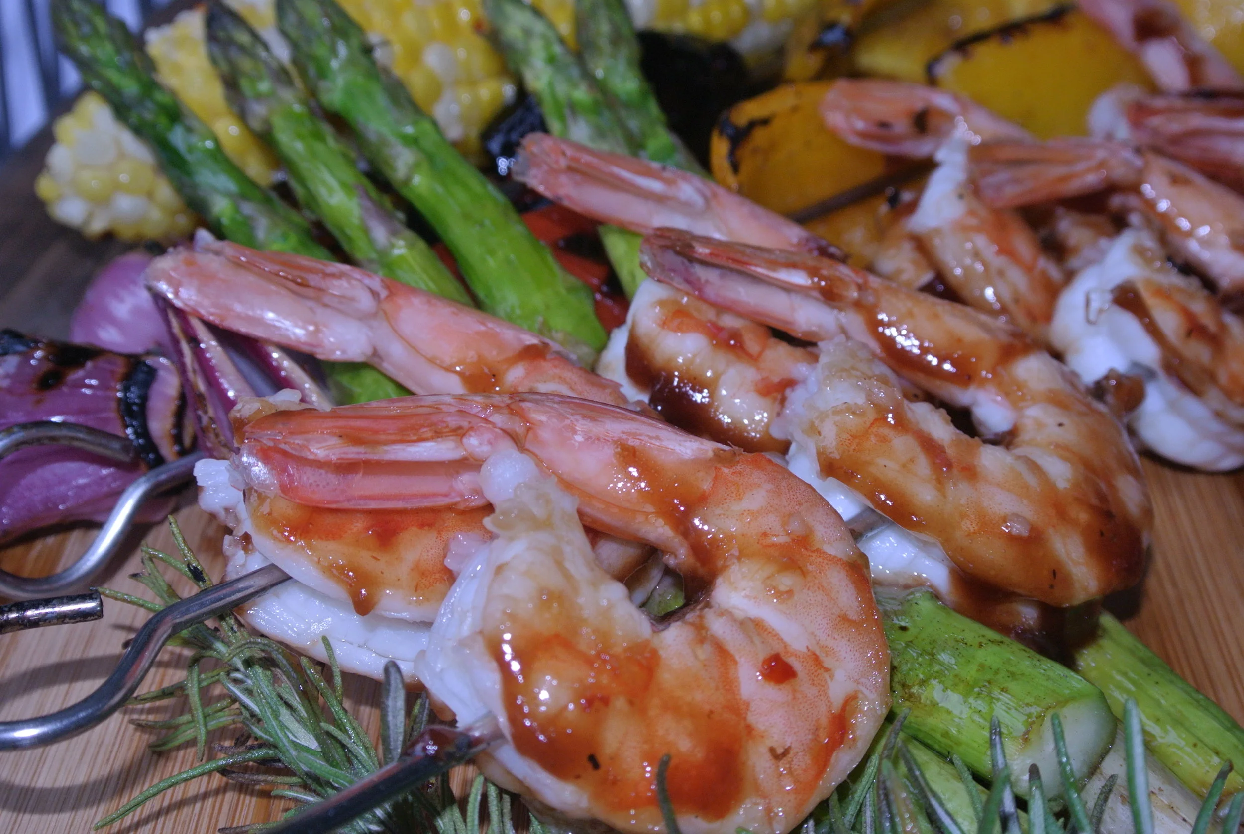 Featured image: Honey glazed shrimp kabobs with vegetables, served over asparagus