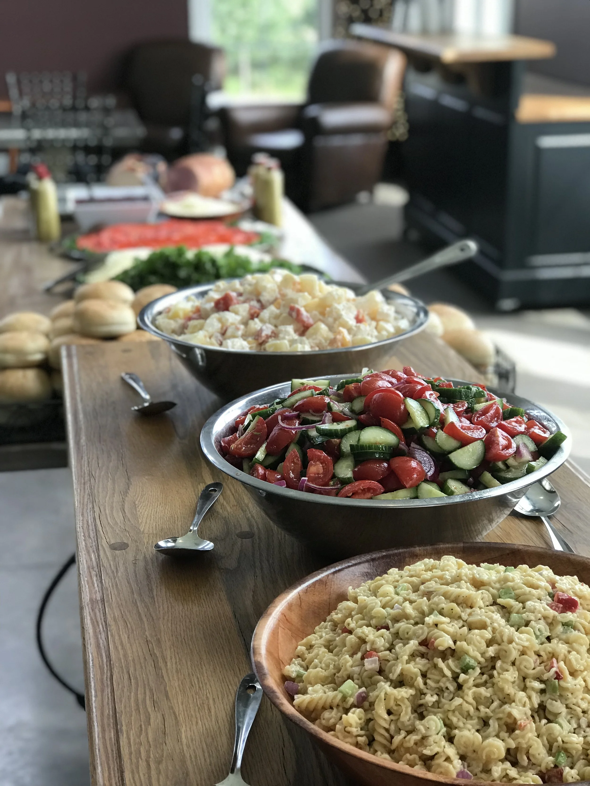 Featured image: Cold salads: potato salad & tomato, cucumber, red onion summer salad & pasta salad